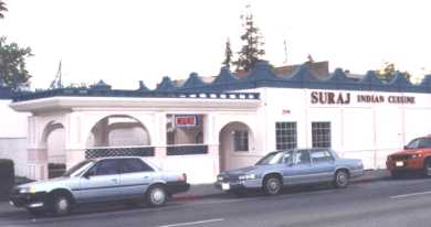 Go past two traffic lights. Second traffic light is Center street. Suraj is located on the right side of the road next to SUPER 8 motel